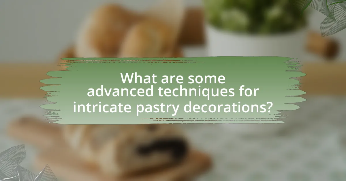 Advanced techniques for intricate pastry decorations include sugar work, chocolate tempering, and airbrushing. Sugar work involves creating delicate structures like spun sugar or sugar flowers, which add elegance to pastries. Chocolate tempering allows for the creation of shiny, stable chocolate decorations such as curls, shards, and molded shapes, enhancing both flavor and presentation. Airbrushing enables precise color application and intricate designs on pastries, providing a professional finish. These techniques are widely used by pastry chefs to elevate the aesthetic appeal of desserts, making them suitable for special occasions.