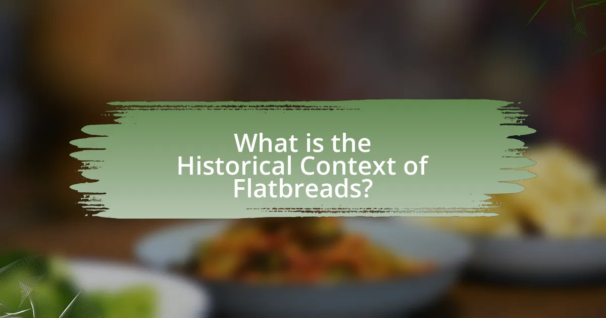 Flatbreads have a historical context that dates back thousands of years, with evidence of their existence found in ancient civilizations such as Mesopotamia around 3000 BCE. Archaeological findings, including remnants of flatbreads in ancient ovens, indicate that these simple, unleavened breads were staples in the diets of early agricultural societies. The use of grains like wheat and barley in flatbread production reflects the agricultural practices of these civilizations, which laid the foundation for bread-making techniques that evolved over time. Additionally, flatbreads spread across cultures, adapting to local ingredients and cooking methods, which is evidenced by the variety of flatbreads found in regions such as the Middle East, India, and Europe.